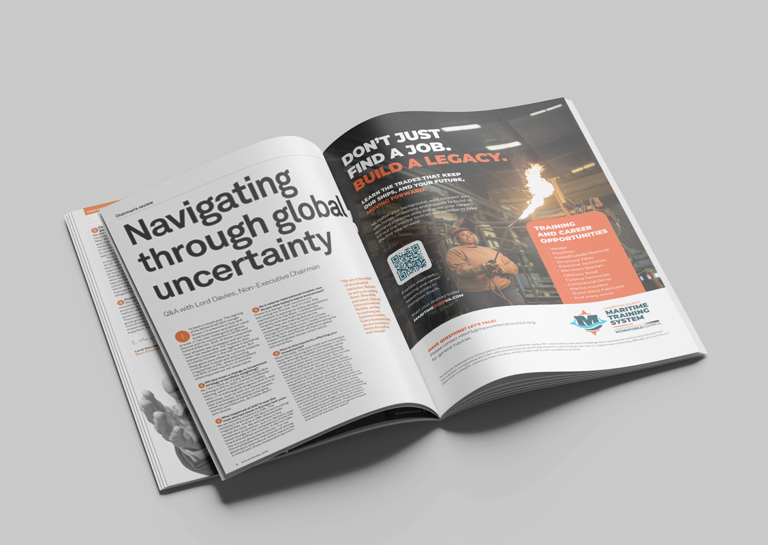 This work represents a snapshot of ongoing creative development focused on promoting maritime career pathways and training opportunities throughout Hampton Roads. Efforts centered on tailoring messaging to key audiences—including students, transitioning service members, veterans, and employers—while maintaining a clear, unified brand presence across channels. By aligning visual identity, tone, and storytelling, the work helped position HRMTS as the region’s central connector between talent, training providers, and the maritime industry.